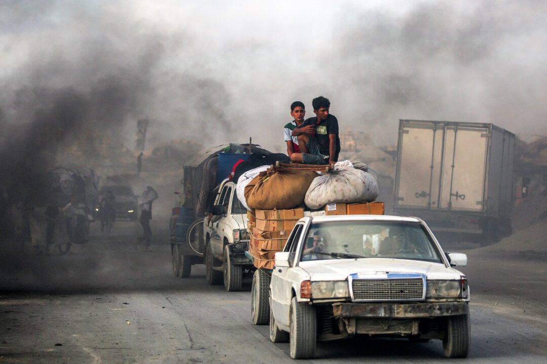 Youths ride atop packages and furniture in a cart towed by another vehicle as people evacuate southbound from Gaza City on Sept. 2, 2025. EYAD BABA/AFP via Getty Images