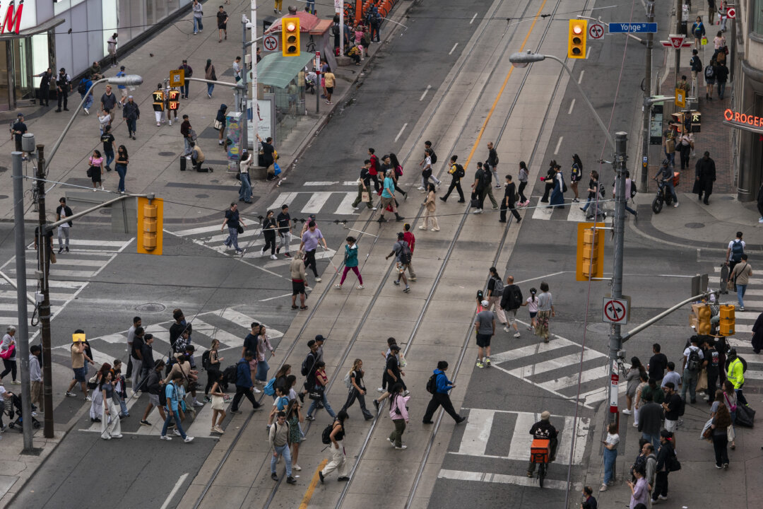People cross the street at Yonge-Dundas Square during rush hour in Toronto on Aug. 28, 2024. The Canadian Press/Paige Taylor White