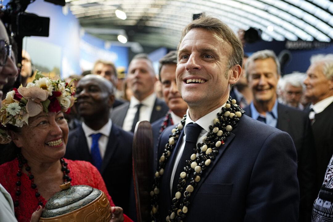 French President Emmanuel Macron (R) visits the French Polynesia stand at La Baleine (The Whale) exhibition centre in Nice, France, on June 8, 2025. Laurent Cipriani//AFP via Getty Images