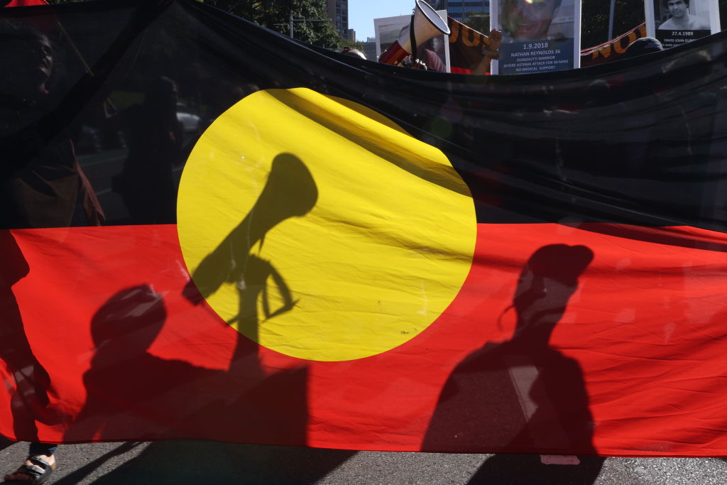 Protesters are seen through an Aboriginal flag during a rally in Sydney, Australia, on April 10, 2021. David Gray/Getty Images