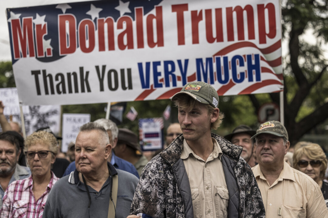 White South Africans supporting U.S. President Donald Trump and South African and U.S. tech billionaire Elon Musk gather in front of the U.S. Embassy in Pretoria, on Feb. 15, 2025. Marco Longari/AFP via Getty Images