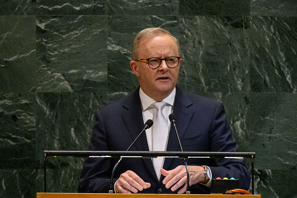 Australian Prime Minister Anthony Albanese speaks at the 80th session of the U.N.’s General Assembly (UNGA) in New York City, on Sept. 24, 2025. Alexi J. Rosenfeld/Getty Images