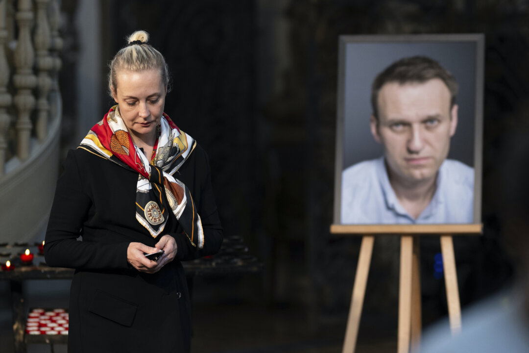 Yulia Navalnaya, widow of Russian opposition leader Alexei Navalny walks away from his picture after lighting a candle at the end of a service in St. Mary’s Church on the occasion of his birthday, in Berlin, on June 4, 2024. Christoph Gollnow/dpa/dpa via AP
