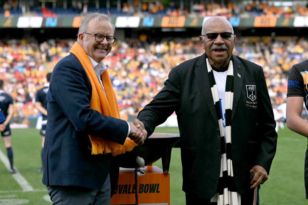 Prime Minister of Australia Anthony Albanese (L) and the Prime Minister of Fiji Sitiveni Rabuka at a rugby union Test match between Australia and Fiji in Newcastle, Australia on July 6, 2025. Saeed Khan/AFP via Getty Images