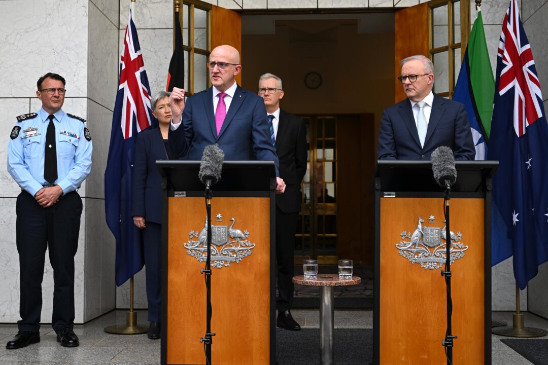Australian Prime Minister Anthony Albanese (R) and Director-General of ASIO Mike Burgess speak to the media during a press conference at Parliament House in Canberra, Australia on Aug. 26, 2025. Behind them stand Reece Kershaw (L), commissioner of the Australian Federal Police, Foreign Minister Penny Wong, and Home Affairs Minister Tony Burke. AAP Image/Lukas Coch