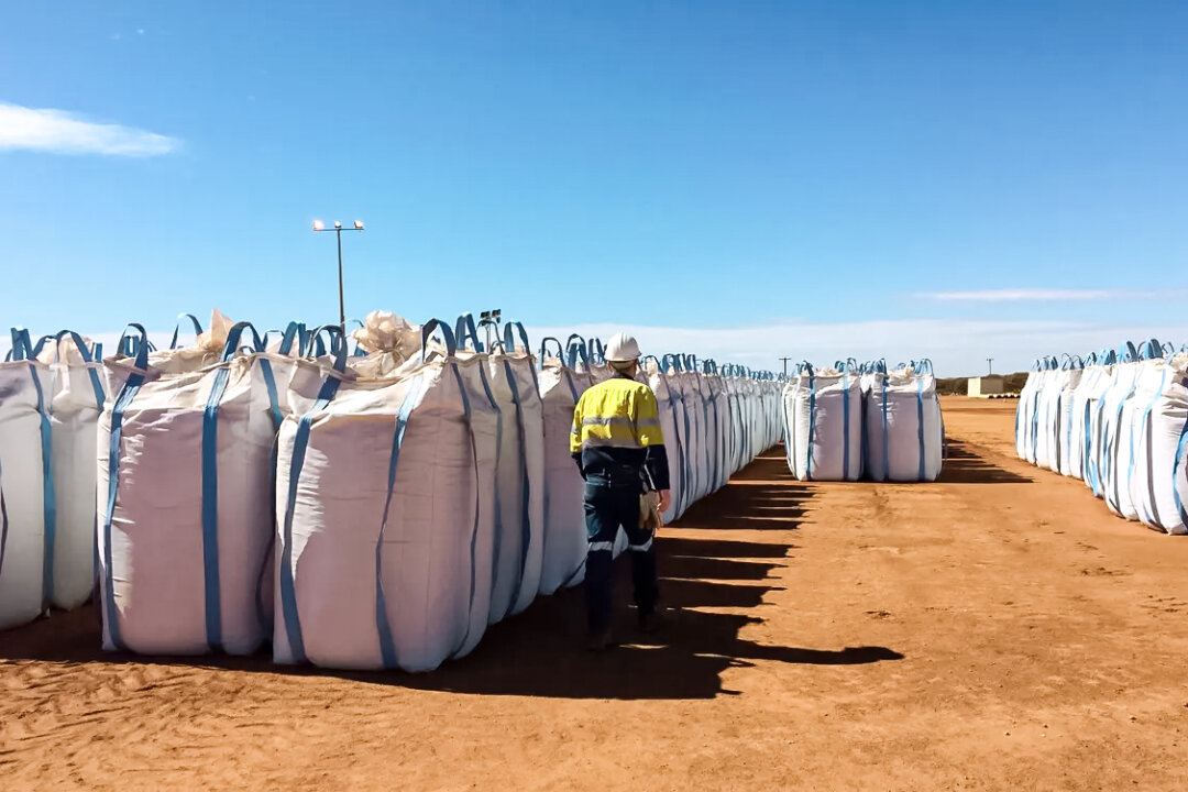A Lynas Corp worker walks past sacks of rare earth concentrate waiting to be shipped to Malaysia, at Mount Weld, northeast of Perth, Australia, on Aug. 23, 2019. Melanie Burton/Reuters