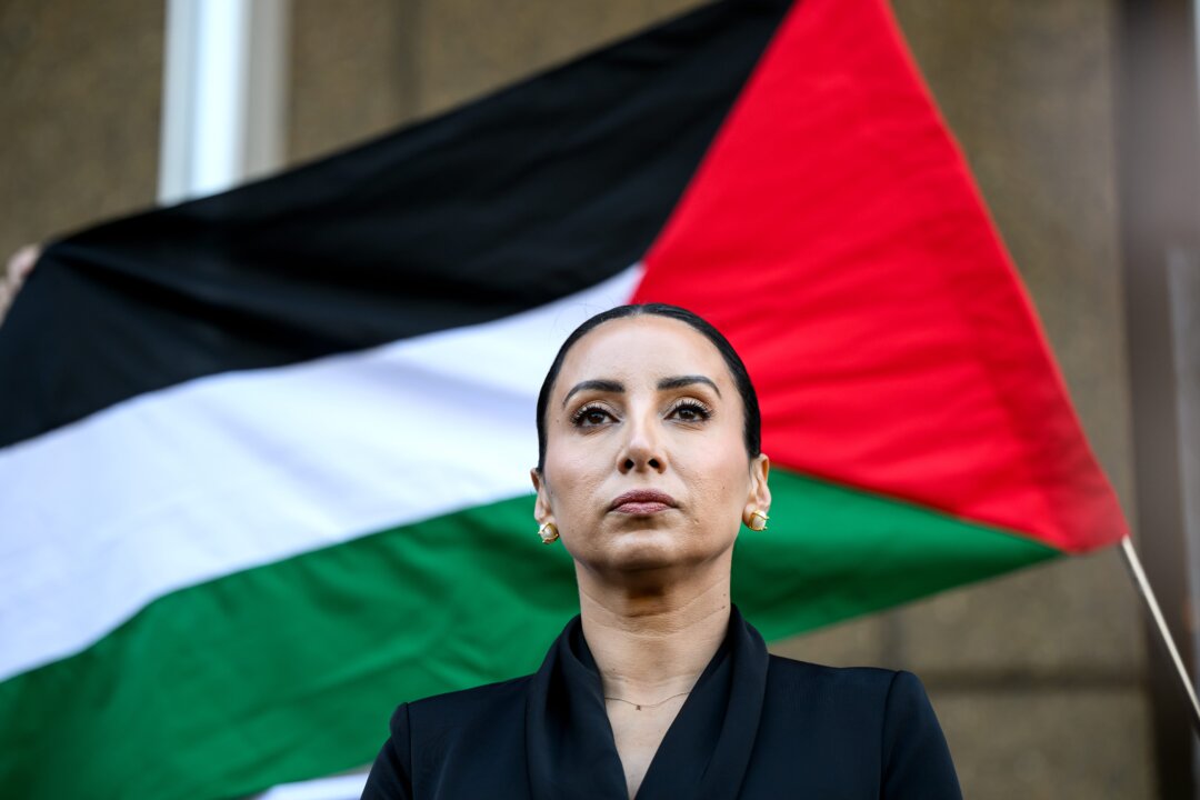 Antoinette Lattouf speaks to the media during a doorstop at the Federal Court in Sydney, Australia, on June 25, 2025. AAP Image/Bianca De Marchi