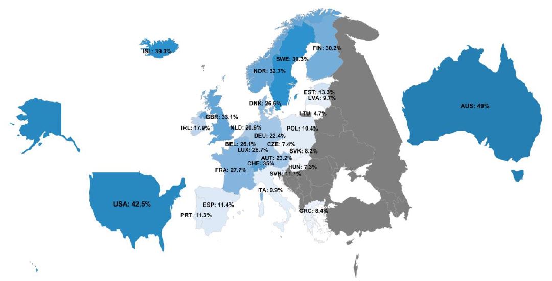 Australian data in the OECD study came from the Household, Income and Labour Dynamics in Australia (HILDA) survey. Data from those under 24 and over 66 years old are excluded.