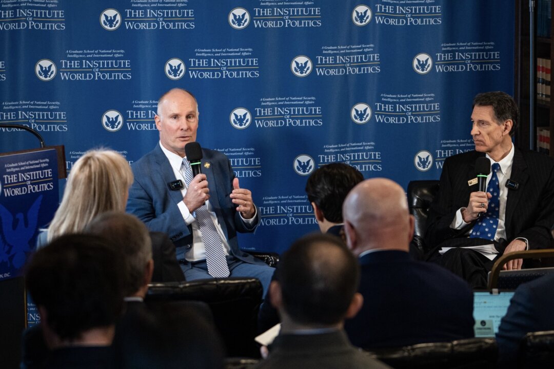 Chairman of the House Select Committee on the Chinese Communist Party (CCP) Rep. John Moolenaar (R-Mich.) (L), and founder, president emeritus, and chancellor of The Institute of World Politics, John Lenczowski (R) speak during an event in Washington on Feb. 11, 2025. Madalina Vasiliu/The Epoch Times