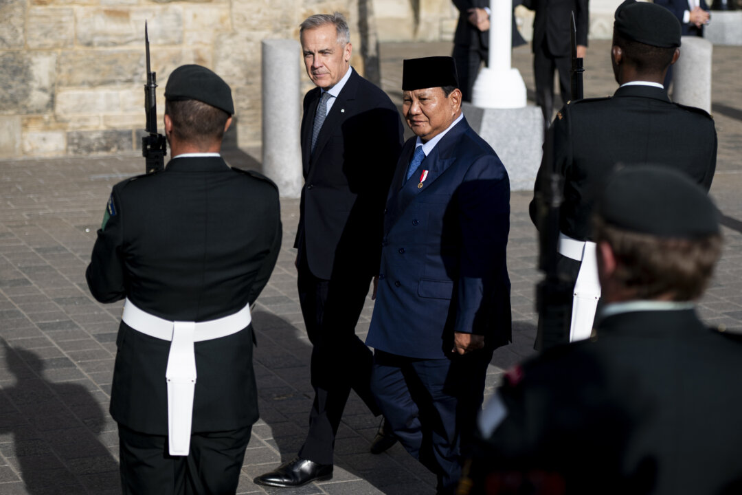 Prime Minister Mark Carney and President of Indonesia Prabowo Subianto inspect the Ceremonial Guard during a working visit on Parliament Hill in Ottawa on Sept. 24, 2025. The Canadian Press/Spencer Colby