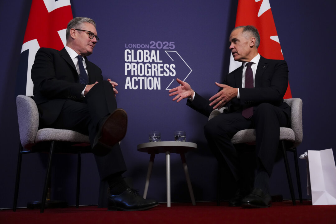 Prime Minister Mark Carney takes part in a bilateral meeting with British Prime Minister Keir Starmer during the Global Progress Action Summit in London on Sept. 26, 2025. The Canadian Press/Sean Kilpatrick