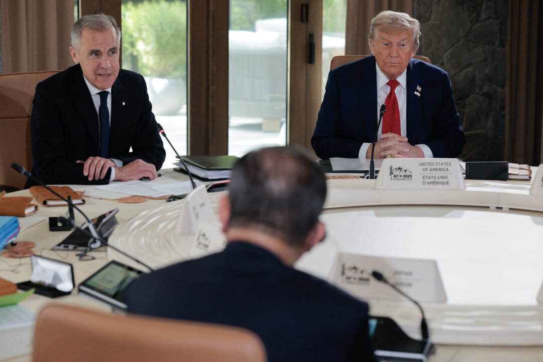 Canadian Prime Minister Mark Carney and U.S. President Donald Trump meet with fellow G7 leaders during a meeting at the G7 Leaders’ Summit in Kananaskis, Alta., on June 16, 2025. Chip Somodevilla/Getty Images