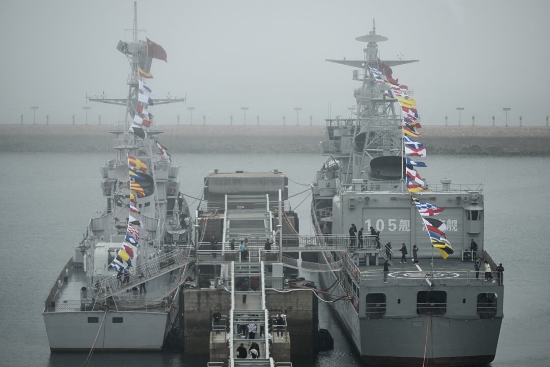 This photo taken during a media tour organised by the Chinese People’s Liberation Army Navy (PLAN) to mark its 75th founding anniversary, shows the Chinese Navy Jinan destroyer (R) at the PLA Naval Museum in Qingdao, Shandong Province, China, on April 23, 2024. Wang Zhao/AFP via Getty Images