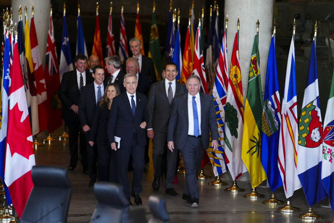 Prime Minister Mark Carney, front left, walks alongside Francois Legault, Premier of Quebec, as they are joined by first ministers and Minister of International Trade and Intergovernmental Affairs and President of the King’s Privy Council for Canada Dominic LeBlanc, and Minister of Transport and Internal Trade Chrystia Freeland as they arrive to take part in the First Minister Meeting at the National War Museum in Ottawa on March 21, 2025. The Canadian Press/Sean Kilpatrick