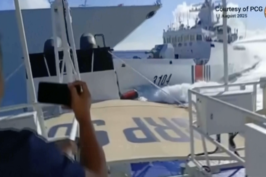 A Chinese navy ship collided with a Chinese Coast Guard vessel while chasing a Philippine boat near Scarborough Shoal in the South China Sea on Aug. 11, 2025. Philippine Coast Guard Handout via The Associated Press/Screenshot via The Epoch Times