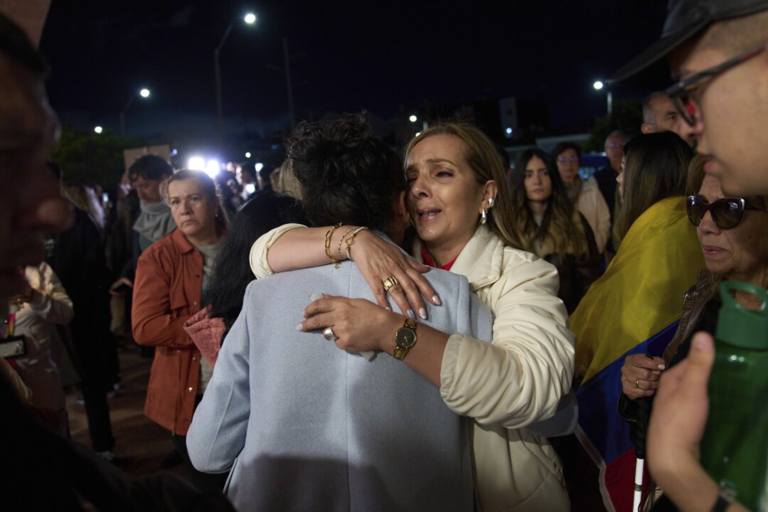 People hug each other outside the clinic where Colombian Sen. Miguel Uribe Turbay is being treated after he was shot at a political rally, in Bogota, Colombia, on June 8, 2025. Ramon Espinosa/AP Photo