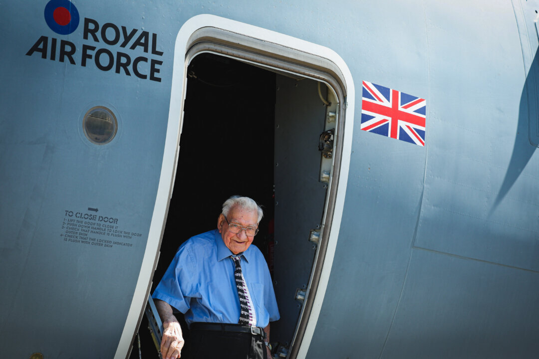 99-year-old Royal Air Force veteran Dennis Bishop poses for a photograph in the door of an Airbus A400M Atlas aircraft, during a VE Day 80 media event at RAF Brize Norton, in Oxfordshire, UK, on April 30, 2025. Bishop served during World War II as a ground radio operator and landed at Normandy after the main landings. He also served in Africa and Europe during the war. Adrian Dennis/AFP via Getty Images