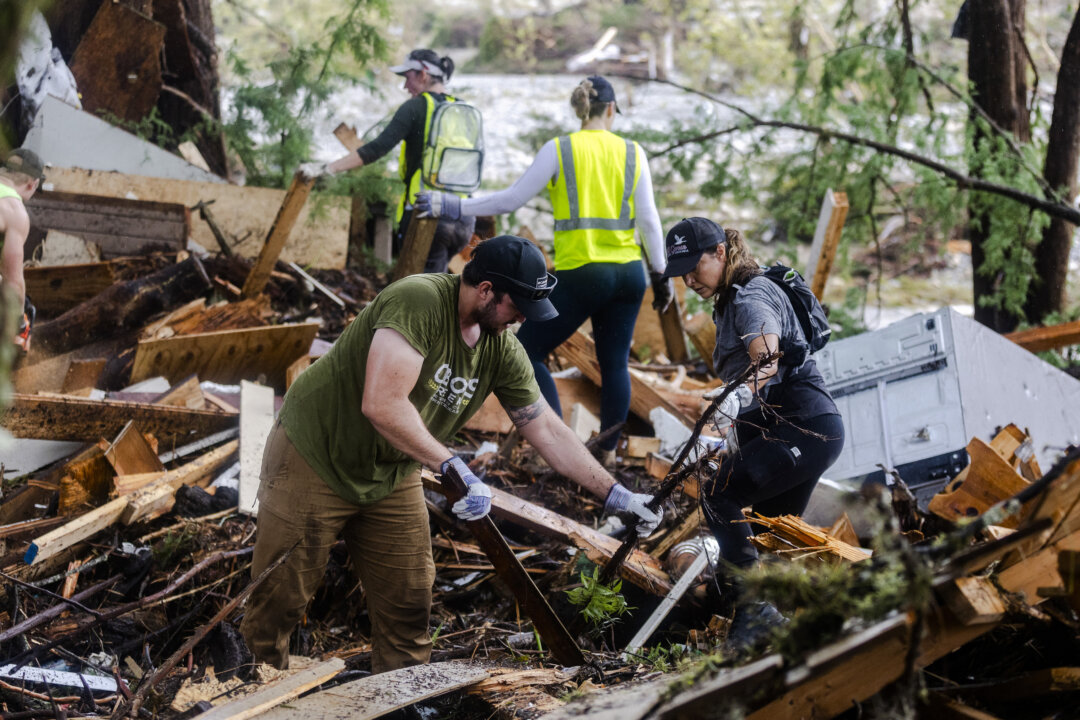 Search and rescue workers dig through debris looking for any survivors or remains of people swept up in catastrophic flash flooding in Hunt, Texas, on July 6, 2025. Jim Vondruska/Getty Images