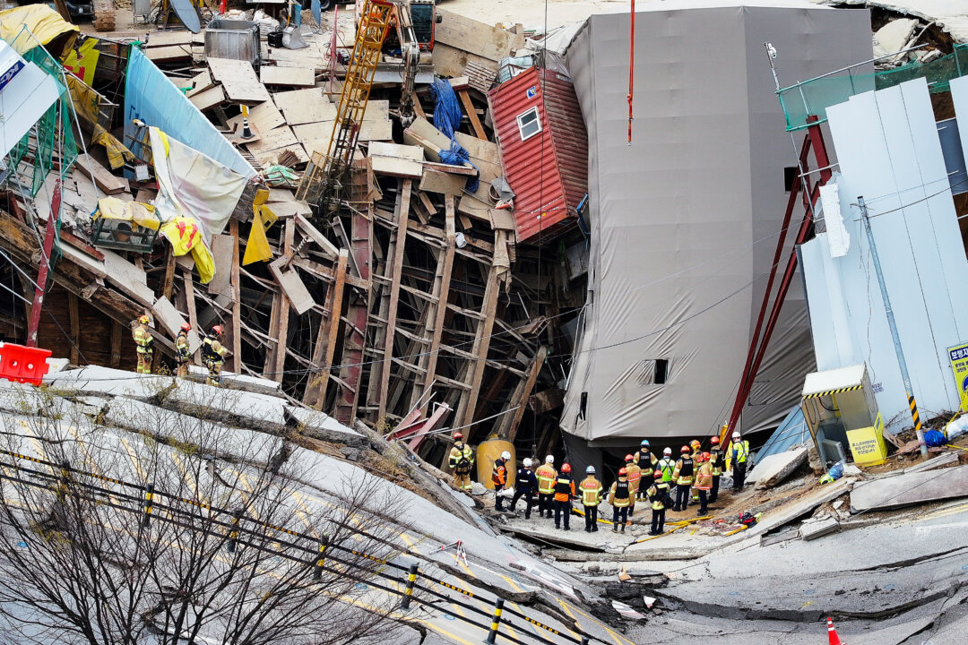 South Korean firefighters work the scene of a collapsed subway construction site in Gwangmyeong, South Korea, on April 12, 2025. The site collapsed on April 11, leaving workers trapped almost 100 feet underground. One of the workers was rescued April 12 after being trapped below the surface for 13 hours. Hong Ki-won/Yonhap via AP