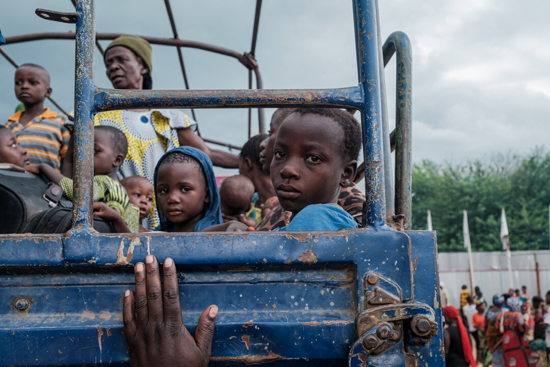Congolese refugees, displaced by ongoing clashes in eastern Democratic Republic of Congo, board a truck upon arrival at the Gihanga refugee transit camp in Gihanga, on Feb. 17, 2025. Tchandrou Nitanga/AFP via Getty Images