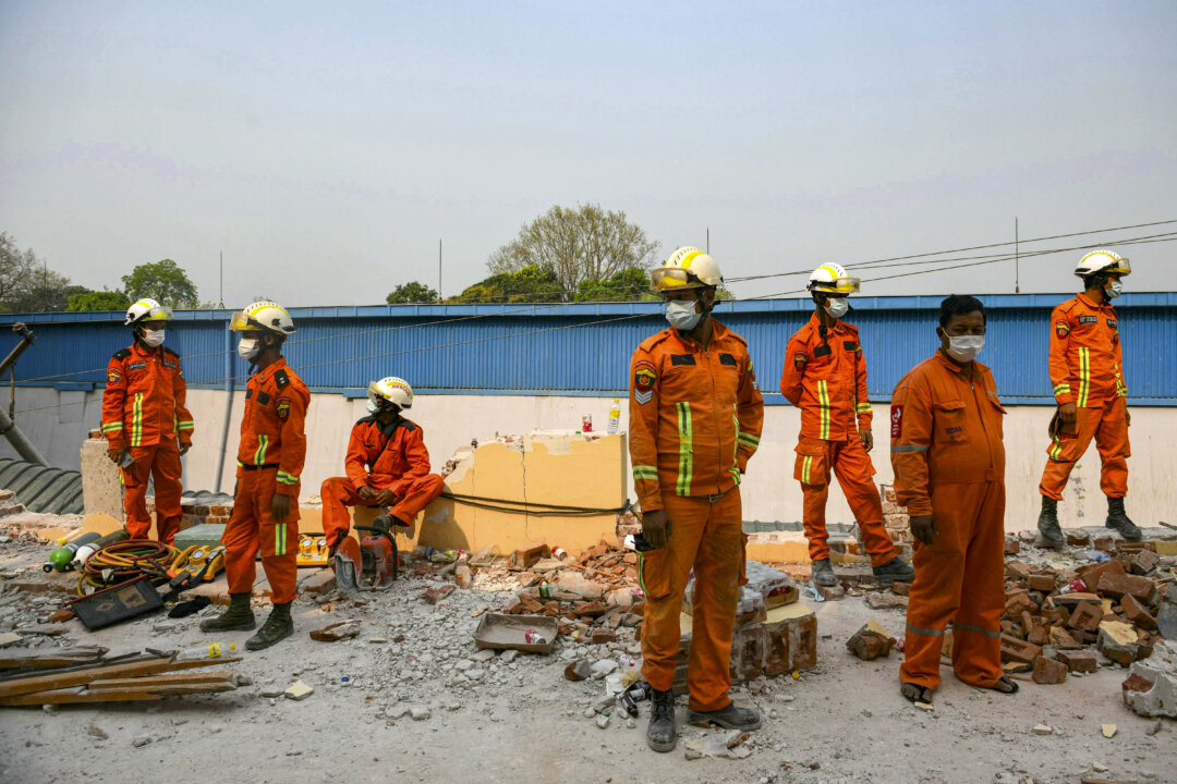 Rescue workers look on as heavy machinery clears rubble at the site where a building under construction collapsed in Bangkok on March 30, 2025. The 33-story building tumbled to the ground, trapping dozens of people, when a 7.7 magnitude earthquake struck Burma (also known as Myanmar) and Thailand on March 28. Manan Vatsyayana/AFP via Getty Images