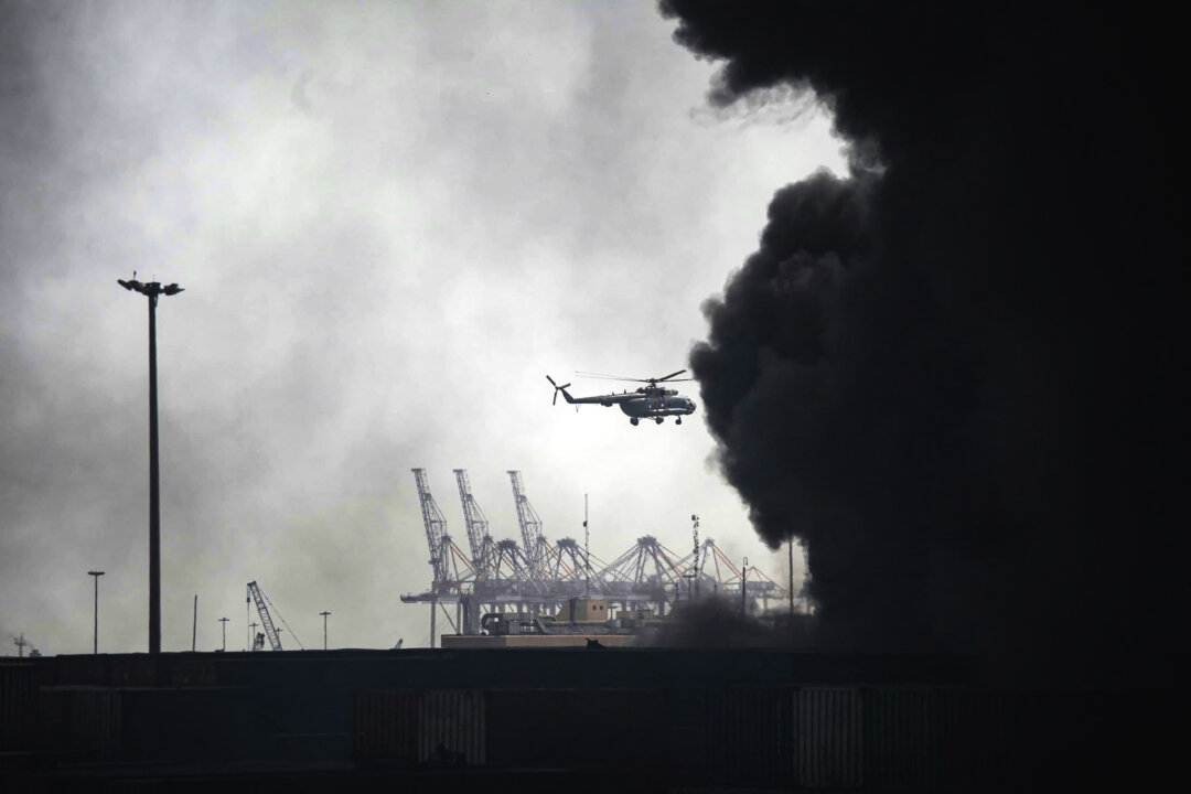 A helicopter flies above the smoke following an explosion at the Shahid Rajaee port dock southwest of Bandar Abbas in the Iranian province of Hormozgan, on April 26, 2025. Several containers exploded on April 26 at Iran’s largest commercial port, authorities said, causing a major blast and fire, and leaving hundreds injured. Shahid Rajaee, more than 1,000 kilometres (620 miles) south of the capital, is the most advanced container port in Iran, according to the official IRNA news agency. Mohammad Rasole Moradi/IRNA/AFP via Getty Images