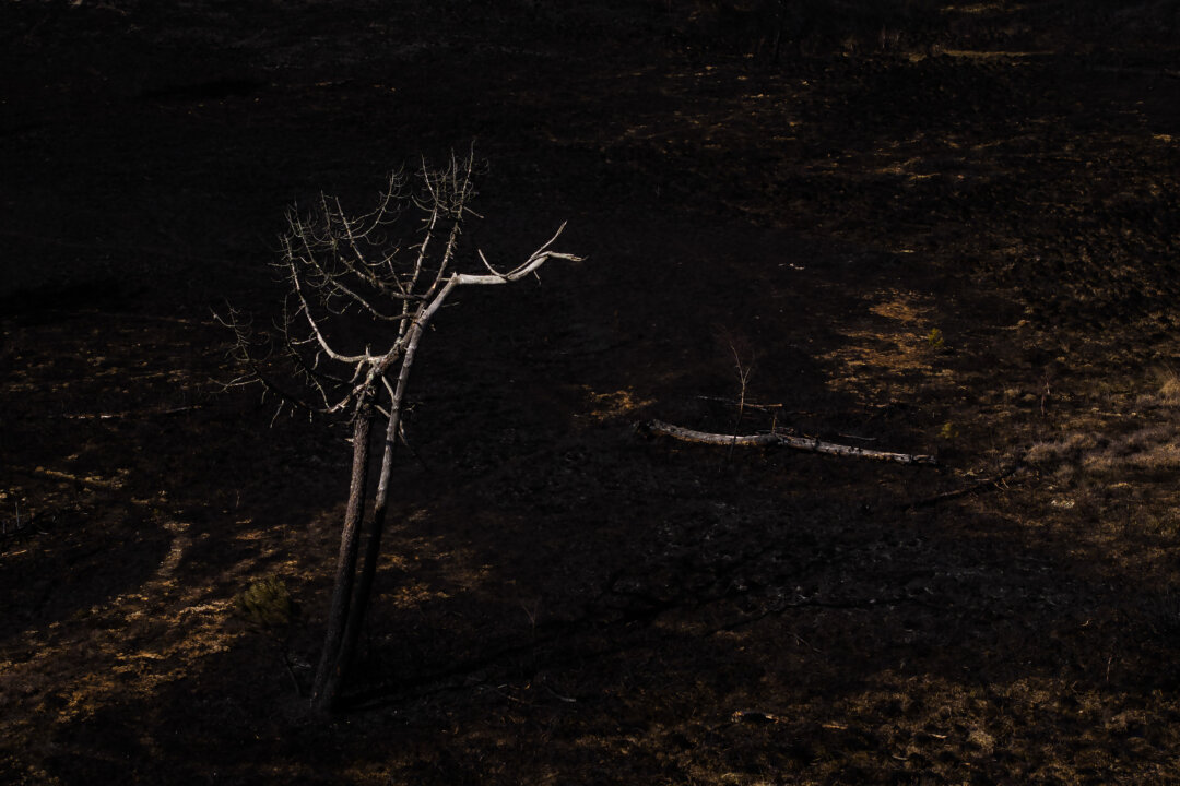 A tree stands above burnt scrub after a fire on Upton Heath in Upton, England, on April 4, 2025. Dan Kitwood/Getty Images