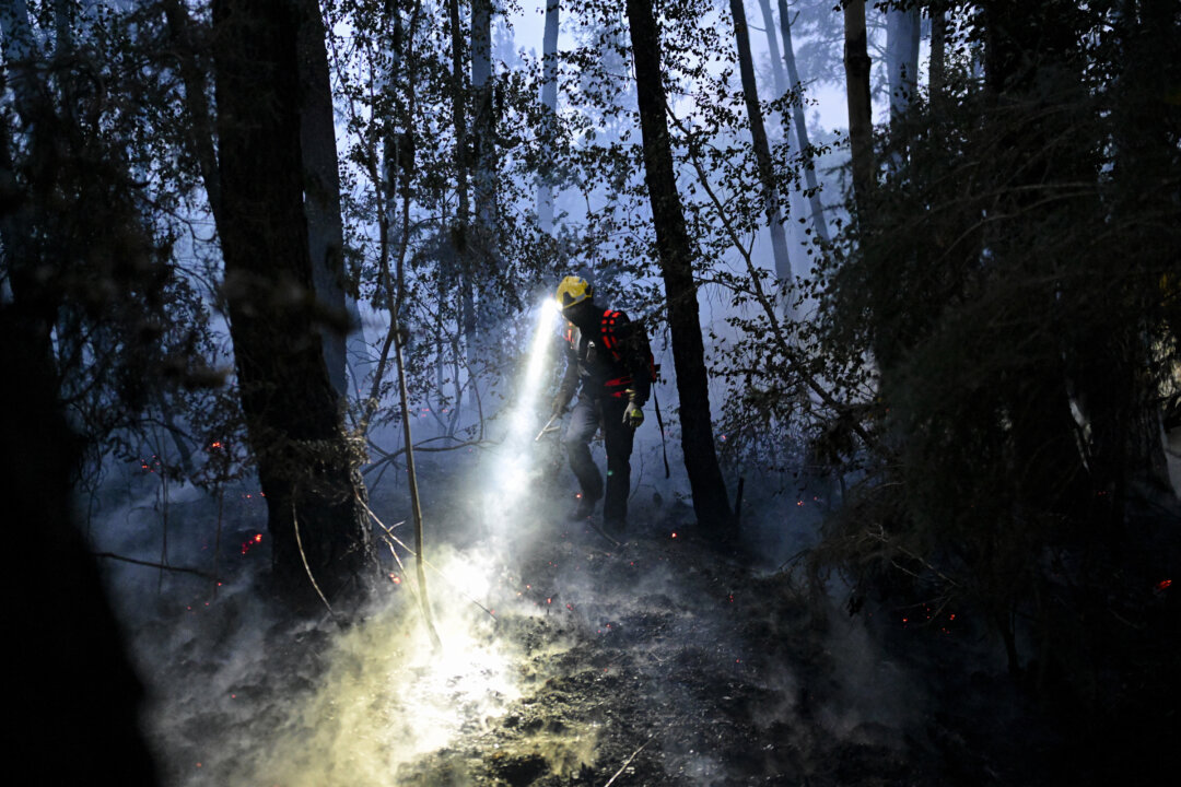 A firefighter works to extinguish a fire as smoke billows, in the Broceliande forest, in Trehorenteuc, France, on July 17, 2025. A major fire broke out on July 17 in a forest west of Rennes, where 250 acres of vegetation had burned by late afternoon, according to officials. Damien Meyer/AFP via Getty Images
