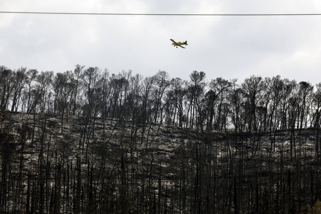 A fire fighting plane flies over charred trees after a fire near the central Israeli town of Bet Shemesh on May 2, 2025. Ahmad Gharabli/AFP via Getty Images