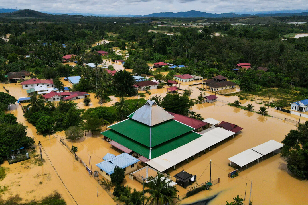 An aerial view shows a mosque and residential buildings surrounded by flood waters after overnight heavy rain in Karak, Malaysia’s Pahang state, on Feb. 19, 2025. Mohd Rasfan/AFP