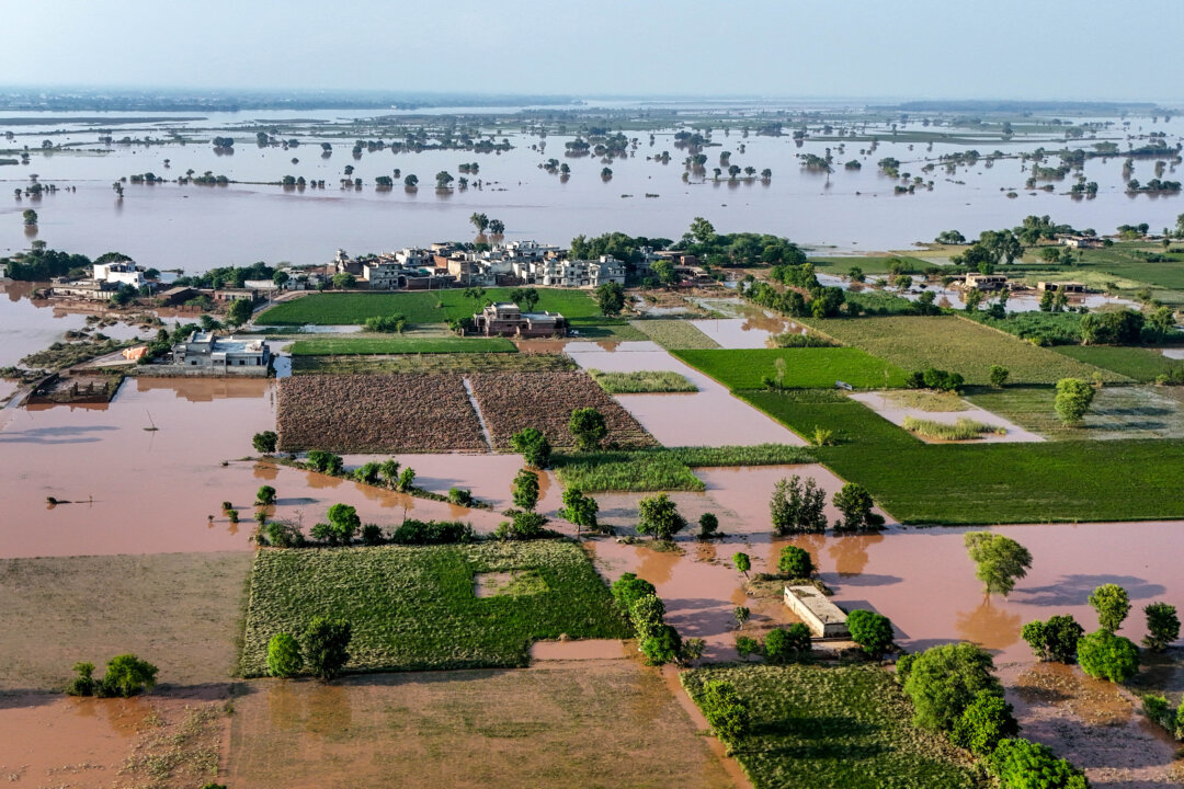 An aerial view of crops and houses submerged in floodwater at Chak Ali Sher village in Wazirabad district, Pakistan, on Aug. 28, 2025, after the government issued a flood alert for riverside areas of Punjab province. Aamir Qureshi/AFP via Getty Images