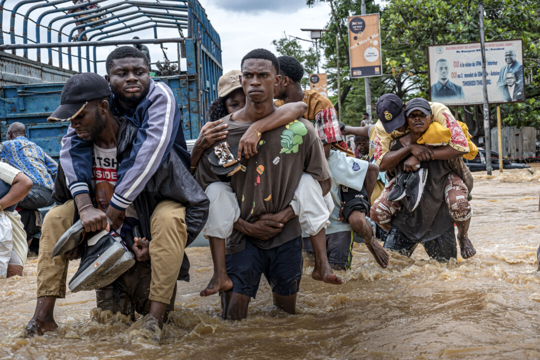 Residents wade through murky floodwaters following heavy rains in the Ndjili district of Kinshasa, DR Congo, on April 6, 2025. Heavy downpours in the Democratic Republic of Congo’s capital Kinshasa have left around 30 people dead while wrecking havoc in the central African megacity, an official told AFP. Hardy Bope/AFP via Getty Images