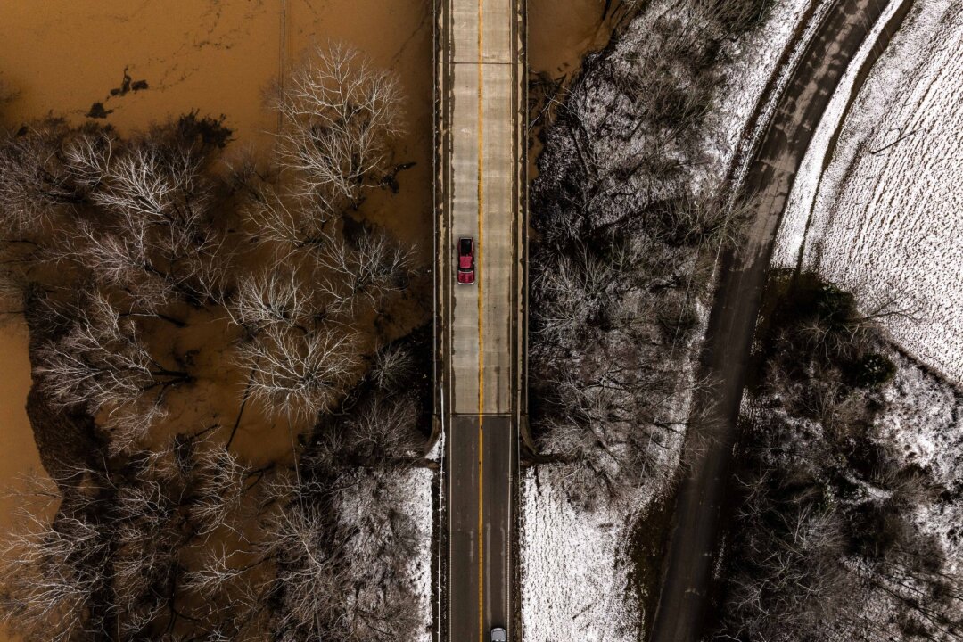 The Barren River floods around Kentucky Route 185 in Bowling Green, Ky., on Feb. 16, 2025. Severe winter storms brought torrential rains causing intense flooding in Kentucky and parts of Florida and Georgia. Brett Carlsen/Getty Images