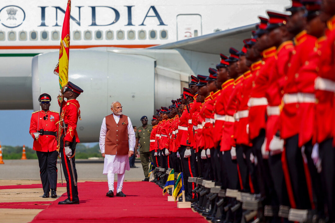Indian Prime Minister Narendra Modi inspects guard of honor upon his arrival in Accra, Ghana, on July 2, 2025. PIB/AFP via Getty Images