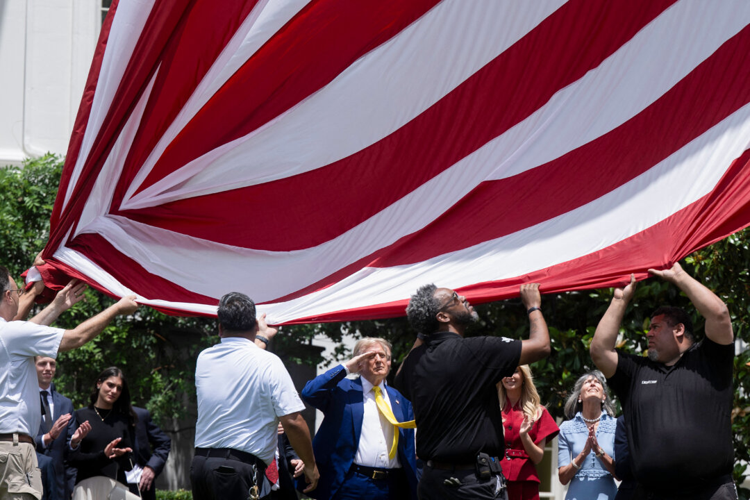 President Donald Trump salutes as a U.S. flag is raised on a newly installed flagpole on the South Lawn of the White House in Washington on June 18, 2025. Brendan Smialowski/AFP via Getty Images