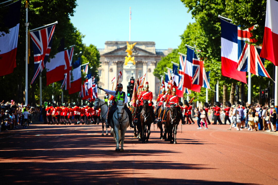 Members of the Canadian Regiment perform ceremonial transition of duties for the King’s Life Guard at Horse Guards Parade in London on July 11, 2025. Alishia Abodunde/Getty Images
