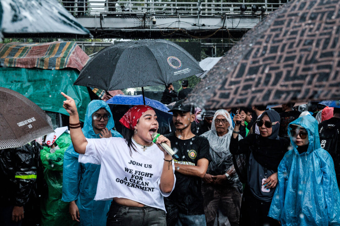 Protesters attend a demonstration against President Prabowo Subianto’s government, calling for various demands, including reviews of government budget cuts and the free nutritious meal program for schools in front of a police barricade in Jakarta, Indonesia, on Feb. 21, 2025. Yasuyoshi Chiba/AFP via Getty Images