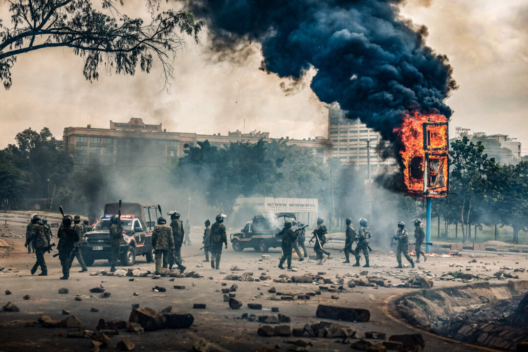 Members of Kenya security forces gather near a burning billboard in downtown Nairobi on June 25, 2025, during a planned day of protest to mark the first anniversary of the storming of the parliament. Luis Tato/AFP via Getty Images