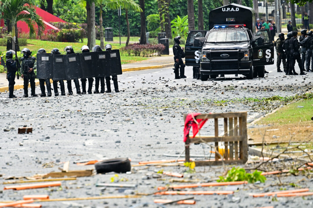 Riot police officers take position during a protest against a bill being discussed by the Chamber of Deputies to raise the retirement age by three years in Panama City, on Feb. 12, 2025. A policeman was injured, and more than a dozen protesters were arrested in a protest against a government-sponsored pension reform. Martin Bernetti/AFP via Getty Images