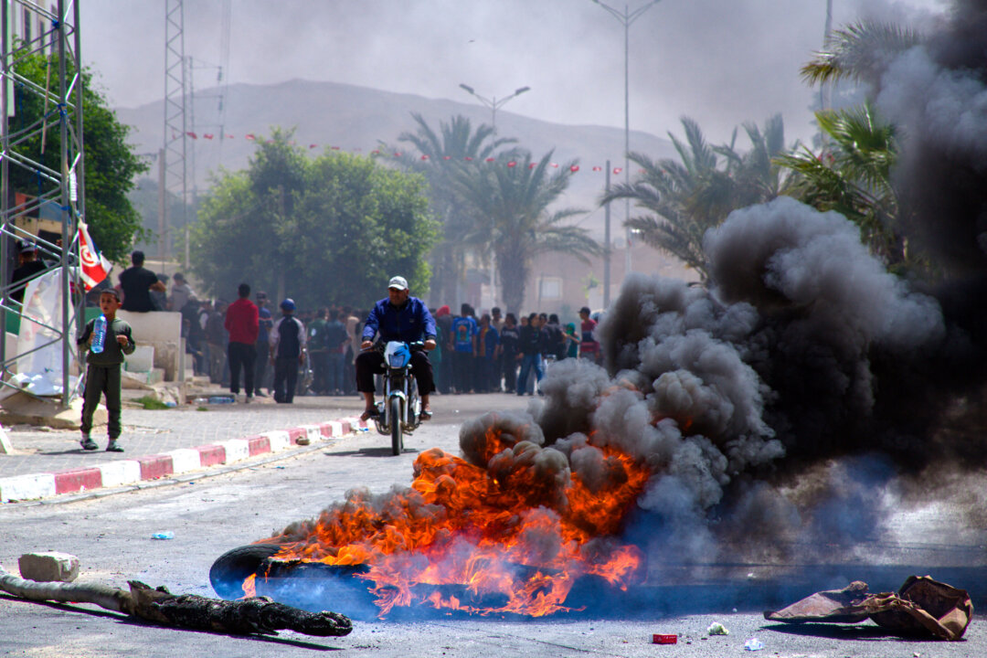 Tunisians burn tires and block a road in Mazouna in Tunisia’s Sidi Bouzid region, on April 15, 2025. Hundreds of Tunisians protested in the small central town after a school wall collapsed and killed three high school students. Saber Sboui/AFP via Getty Images