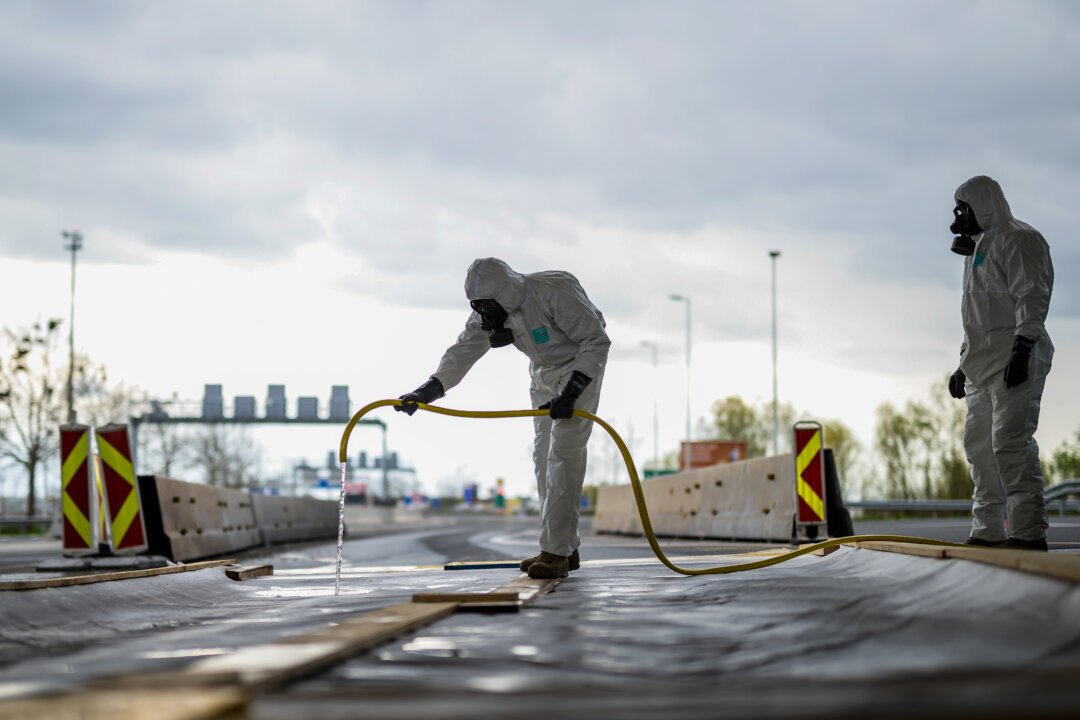 A member of the Austrian Bundesheer—the Austrian armed forces—sprays diluted formic acid on a decontamination pad at the Austria-Hungary border crossing at Nickelsdorf, Austria, on April 7, 2025. Austria has shuttered 24 border crossings to Slovakia and Hungary and is conducting decontamination efforts at others following recent outbreaks of foot and mouth disease in both countries. The highly infectious disease poses no threat to humans, primarily affecting cattle, sheep and other cloven hoofed animals. Outbreaks lead to trade restrictions and containment measures. Christian Bruna/Getty Images