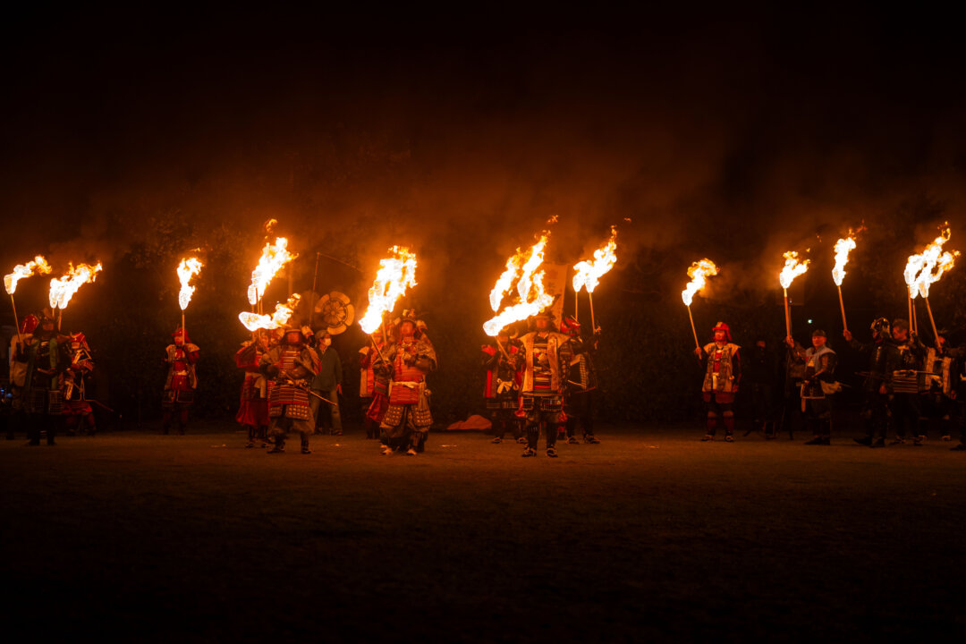 People dressed in samurai warrior costumes hold flaming torches as they march beneath blooming cherry trees during the Kanoukaen Fire Festival at night in Unzen, Nagasaki Prefecture, Japan, on March 29, 2025. The fire festival which is based on a story depicted in a historical scroll over 400 years old was held in the cherry blossom season in the country. Tomohiro Ohsumi/Getty Images