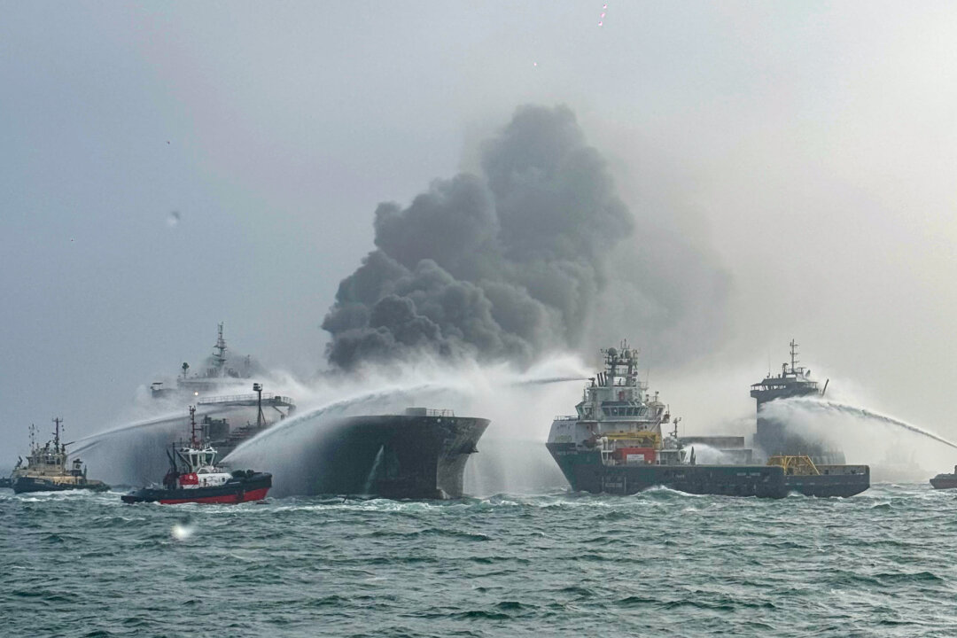 Fire and rescue services attend after a collision between oil tanker MV Stena Immaculate and the cargo vessel MV Solong off the coast of the Humber Estuary, on March 10, 2025 at sea, United Kingdom. Thirty-two people were reportedly brought ashore with injuries after the collision of the oil tanker MV Stena Immaculate and the MV Solong, a cargo vessel, on Monday morning. Lee Whitaker/Getty Images