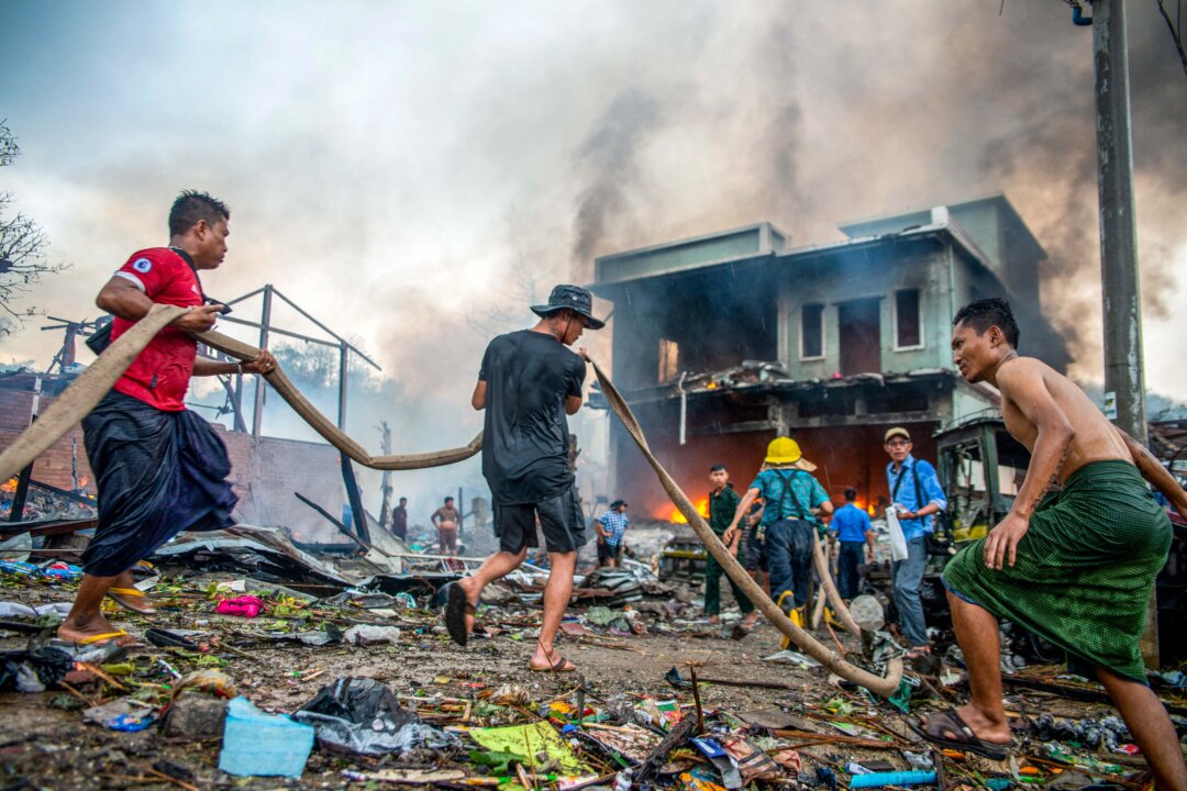 People extinguish a fire in a building destroyed in a bombardment carried out by the military in Thabeikkyin Township in Central Burma (also known as Myanmar), on April 19, 2025. AFP via Getty Images