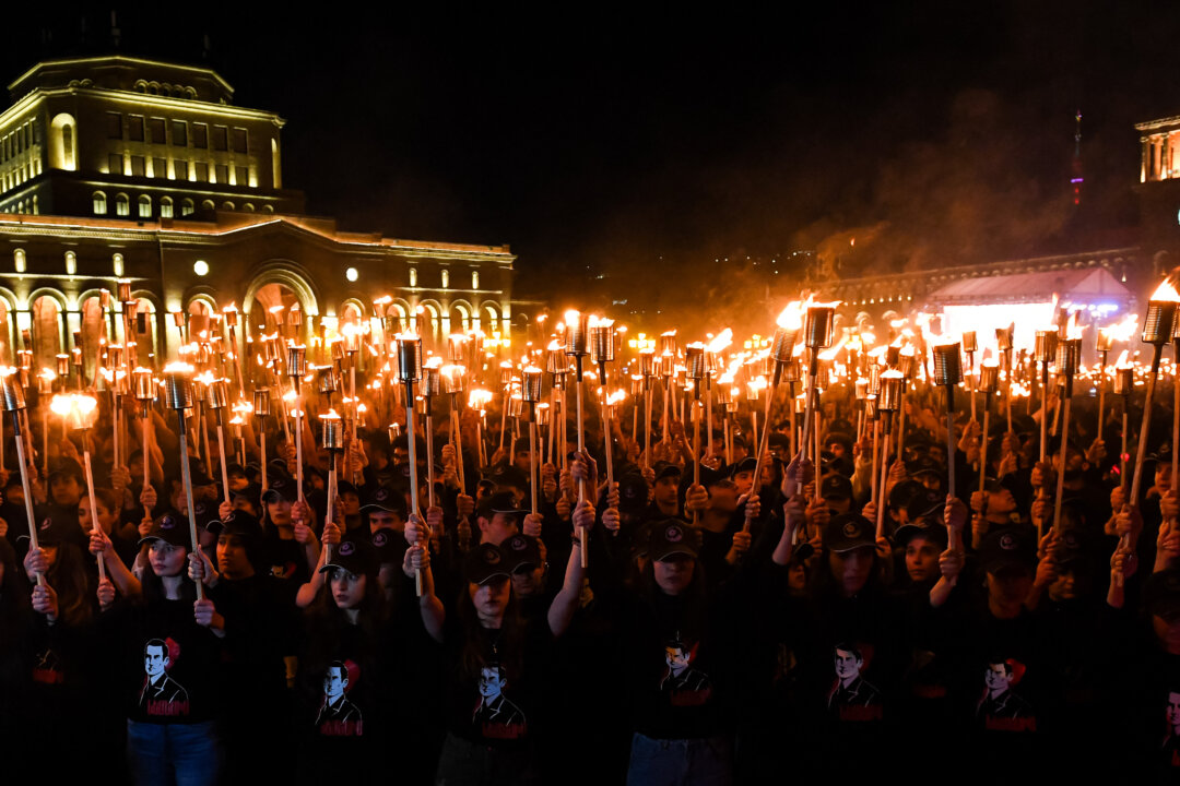 Armenians take part in the annual torch march on the eve of the Genocide Remembrance Day in Yerevan, to mark the 110th anniversary of the World War I-era mass killings of Armenians under the Ottoman Empire in 1915, on April 23, 2025. Karen Minasyan/AFP via Getty Images