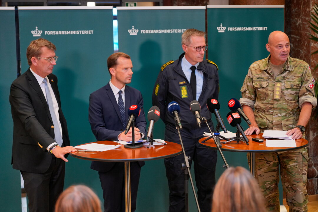 Danish Minister of Defence Troels Lund Poulsen (L), Danish Minister of Justice Peter Hummelgaard (2nd L), Chief of Police Thorkild Fogde (2nd R), and Chief of Defense Michael Hyldgaard (R) hold a press conference on Sept. 25, 2025. Emil Helms/Ritzau Scanpix via AP