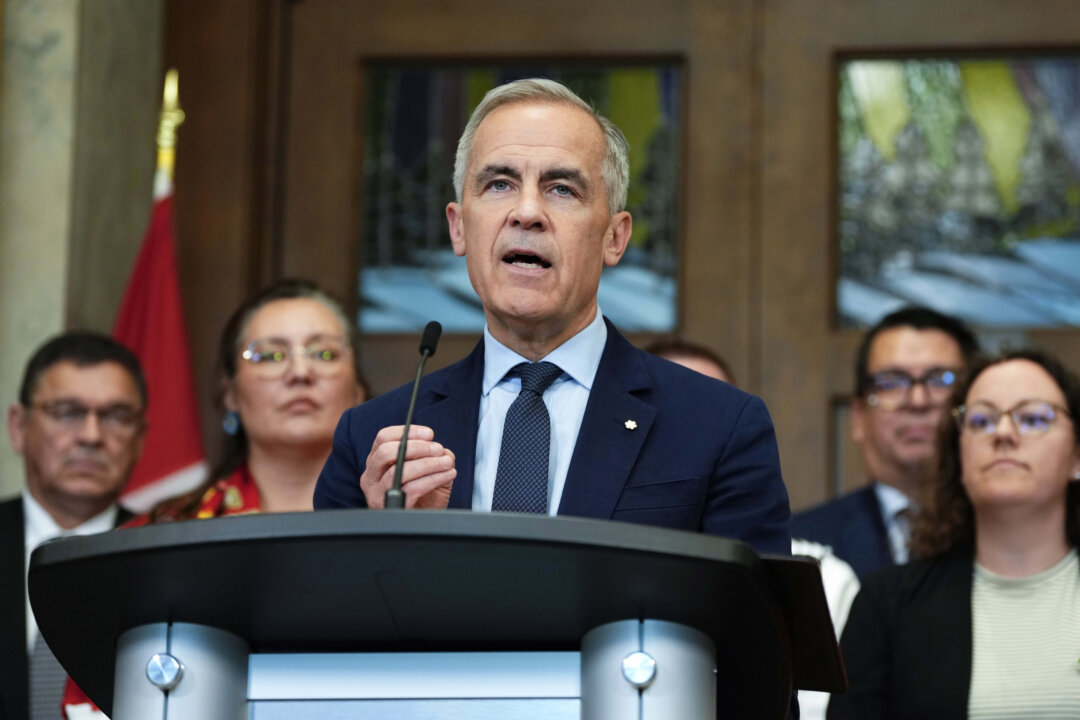 Prime Minister Mark Carney is joined by members of his cabinet and caucus as he speaks at a news conference in the foyer of the House of Commons, on June 20, 2025. The Canadian Press/Justin Tang