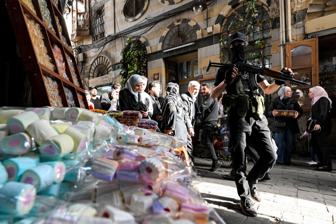 A masked fighter walks with a machine gun in Damascus’s covered market on March 29, 2025. LOUAI BESHARA/AFP via Getty Images