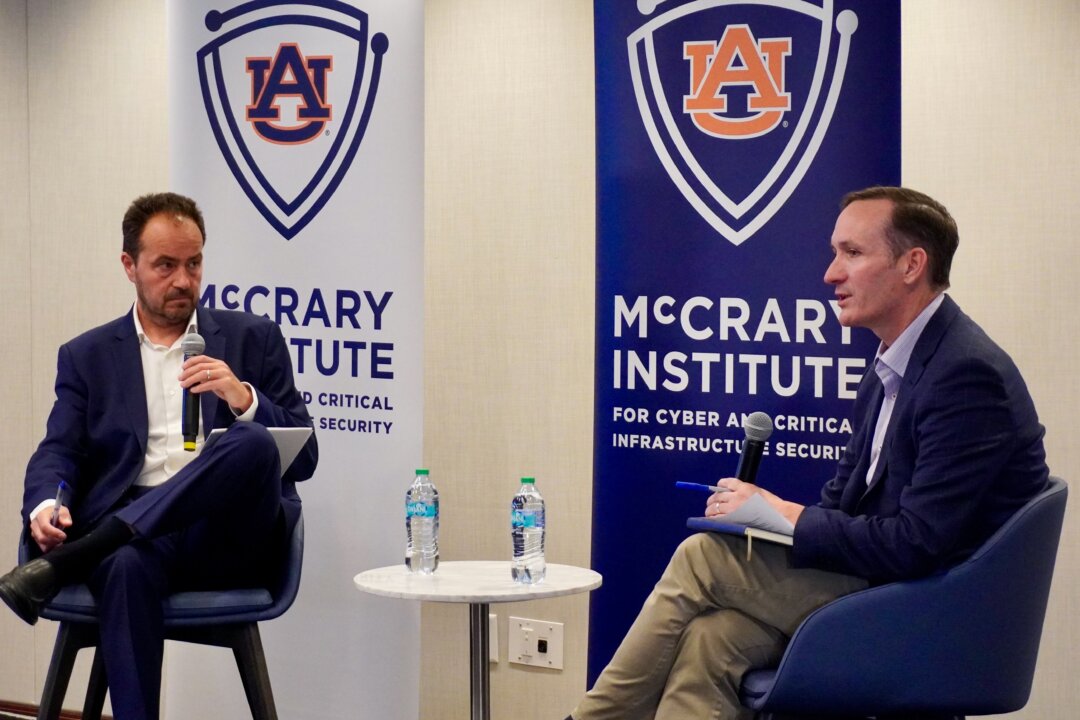Frank Cilluffo (L), director of the McCrary Institute, and Brad Medairy, EVP for National Security and Cyber at Booz Allen Hamilton, discuss port security at an event in Washington on July 31, 2025. Don Kauffman/The McCrary Institute