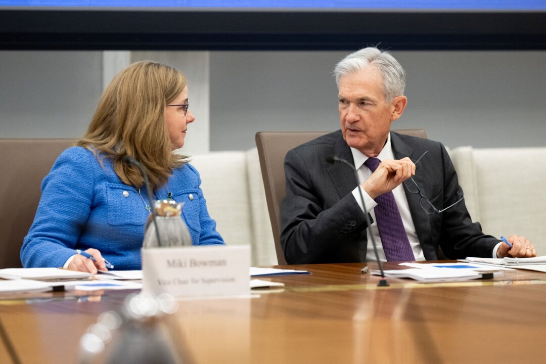 Federal Reserve Chairman Jerome Powell (R) speaks with Vice Chair for Supervision Michelle Bowman (L) at the Federal Reserve Board building in Washington, on June 25, 2025. Saul Loeb/AFP via Getty Images